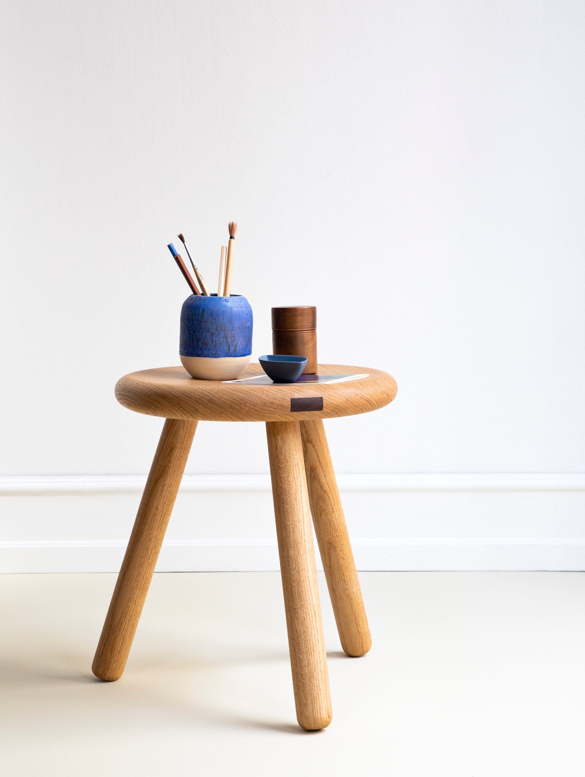 Hånddrejet i gammelt dansk egetræ. Samlet med en lille valnøddedetalje (det mørke firkantede stykke).
