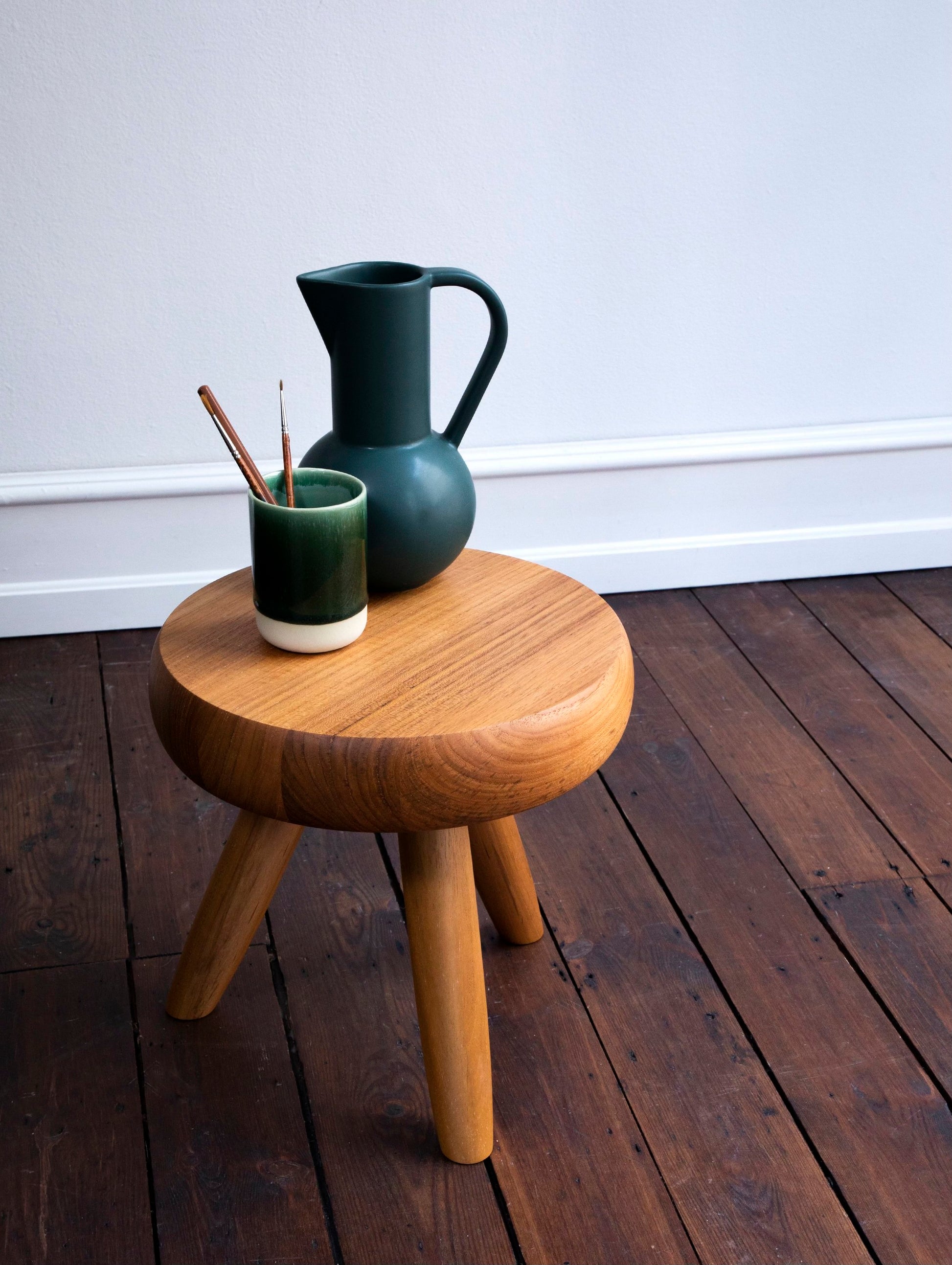 Eksklusiv hånddrejet skammel. Drejet i massiv teaktræ med en smuk glød.